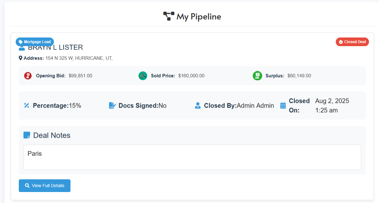 Each lead listed in the CRM will include supporting documents like auction results, case summaries, and county confirmations, pulled during the vetting process. That means when you call, you’re not just another voice on the line; you’ve got proof available which can be texted right away, speeding up the closing process.