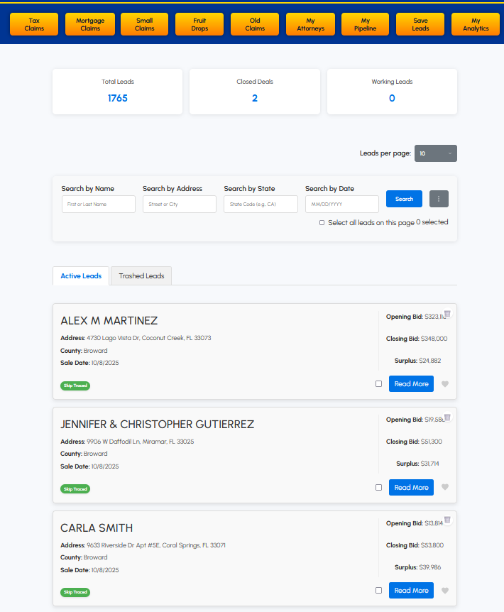 That’s why this system exists. Surplus Fortune gives you fresh, real-time leads pulled directly from county sales, premium skip tracing already done, and access to attorneys who know the process. Everything arrives organized, accurate, and ready for action, so you can focus on closing cases instead of fighting the work.